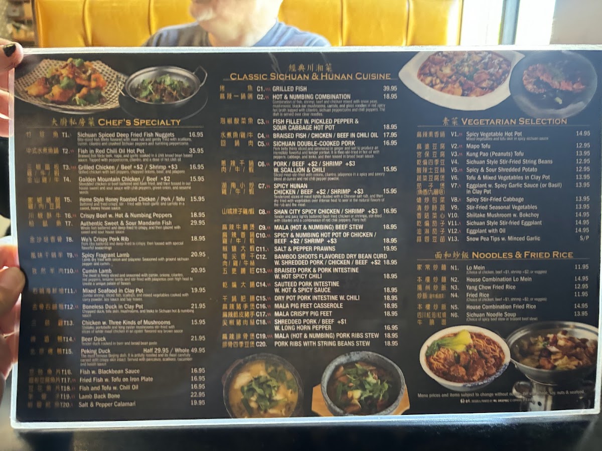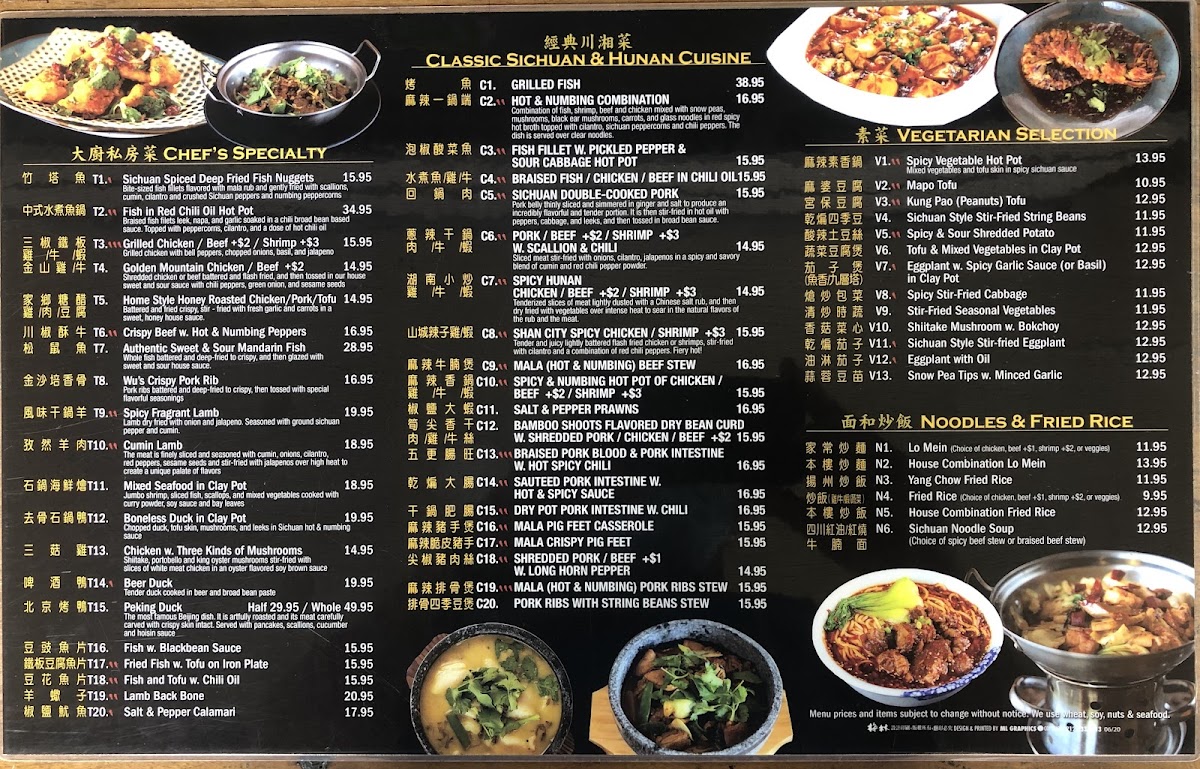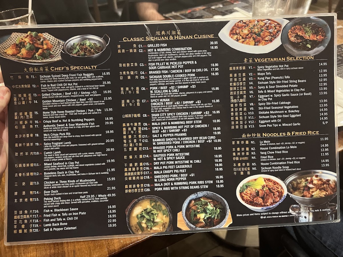 Combination of fish, shrimp, beef and chicken mixed with snow peas, mushrooms, black ear mushrooms, carrots and glass noodles in red spicy hot broth topped with cilantro, sichuan peppercorns and chili peppers. The dish is served over clear noodles